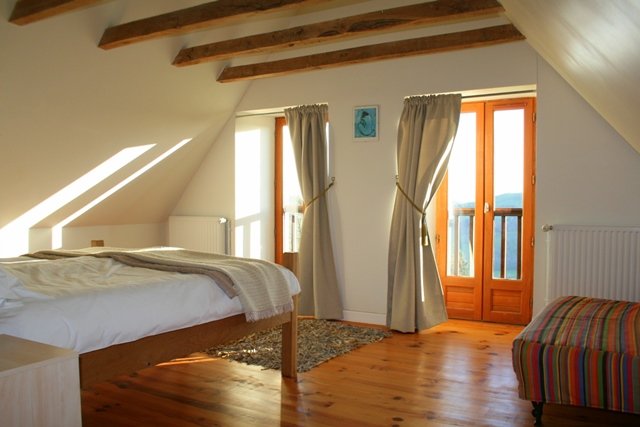 Chambre principale Situé sur la mezzanine, avec une superbe vue sur la vallée, votre propre douche à l’italienne et une baignoire.